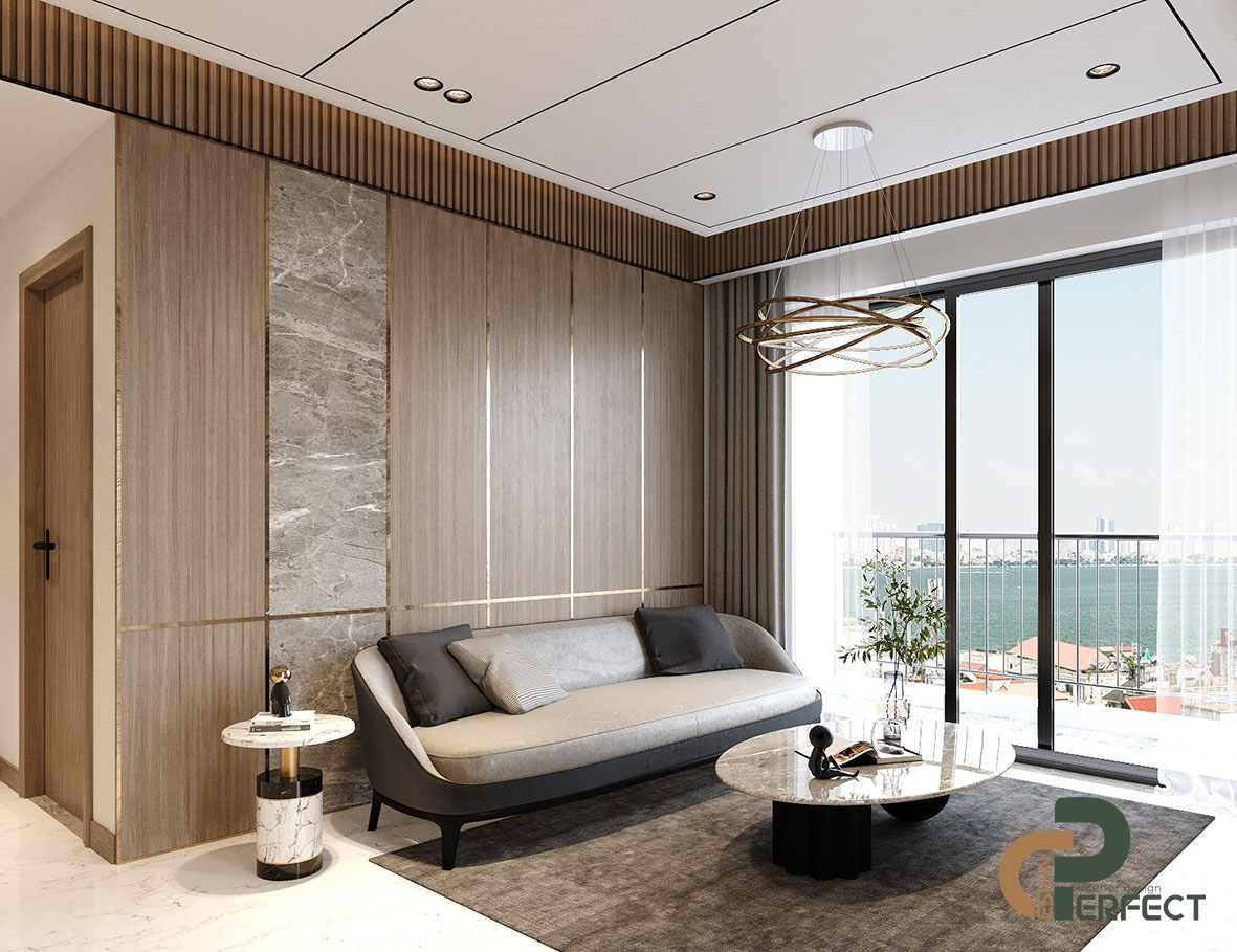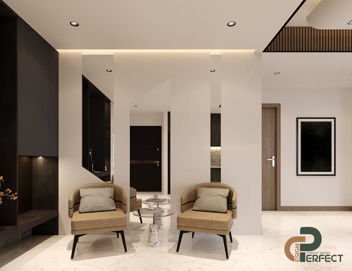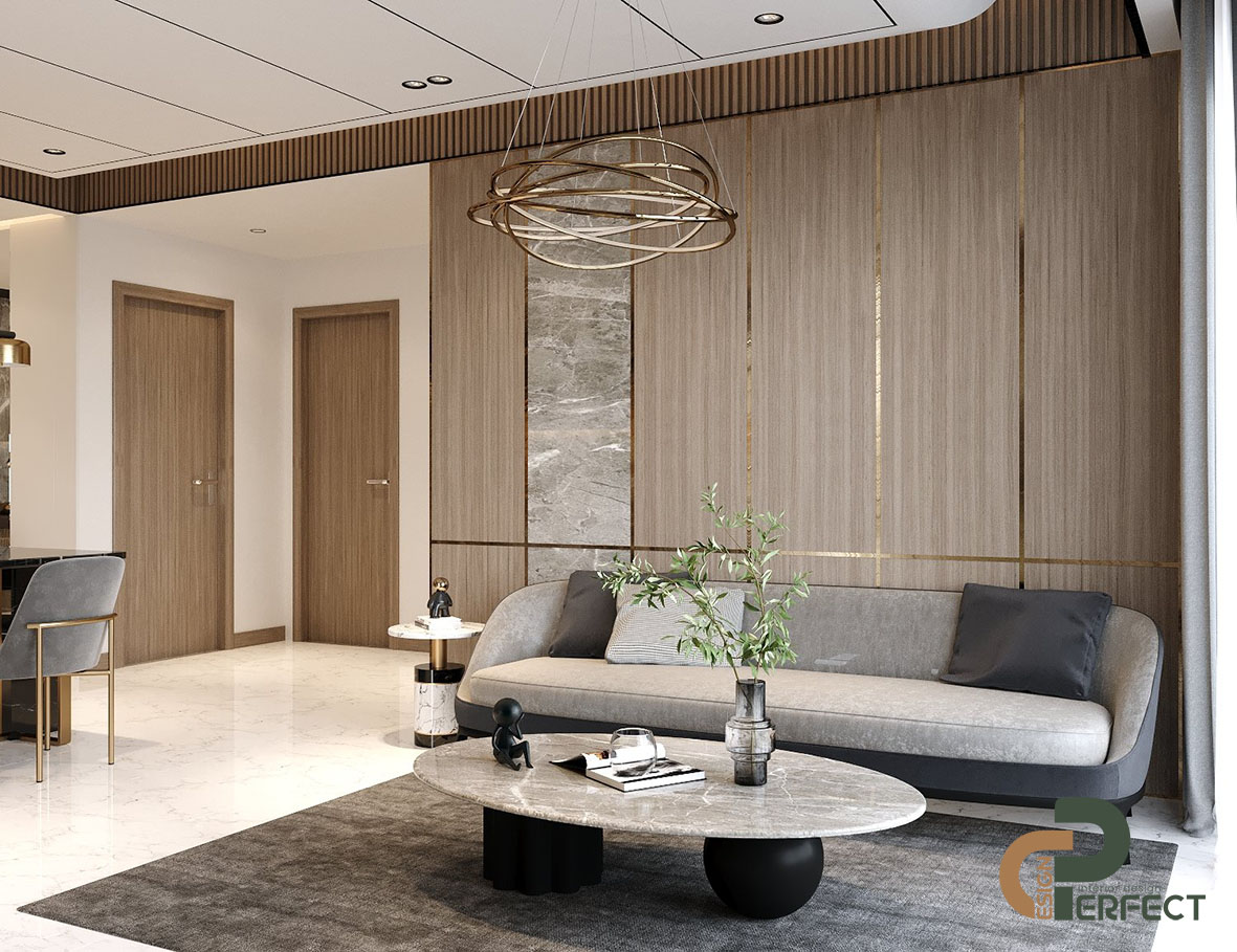 Perfect Design đã chọn phong cách thiết kế tối giản, ít rườm rà cho phòng khách của căn hộ này. Tuy nhiên, vẫn toát lên được vẻ đẹp đương đại và tinh xảo cho không gian. Với tone màu chủ đạo là trắng, đen, xám, nude đã mang đến sự sang trọng và đẳng cấp cho phòng khách căn hộ.
