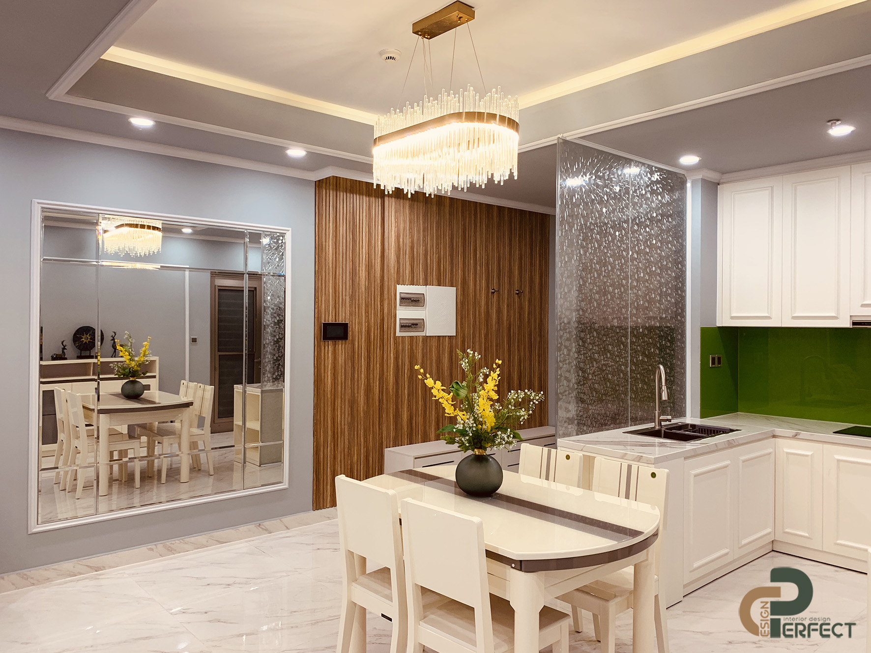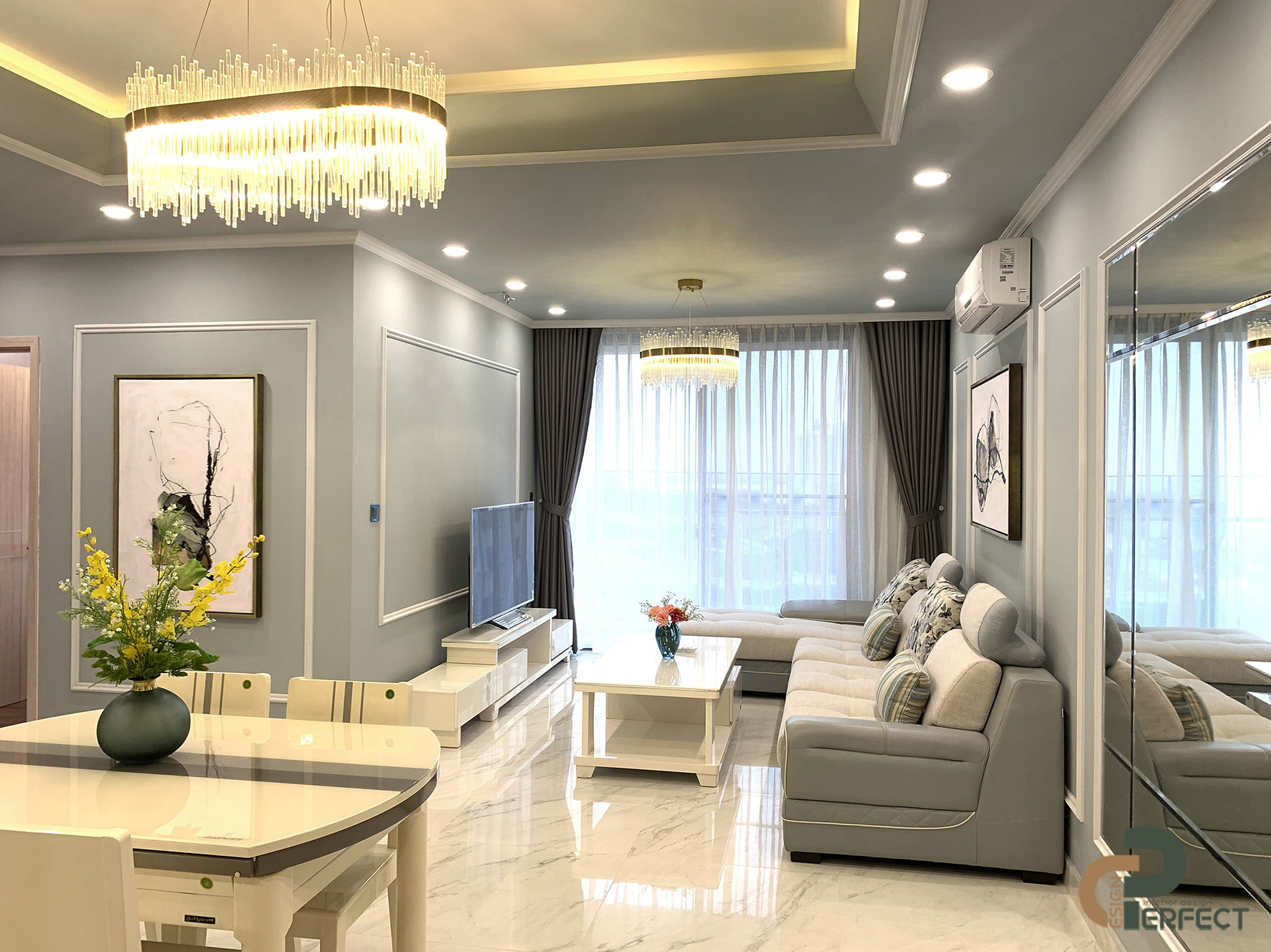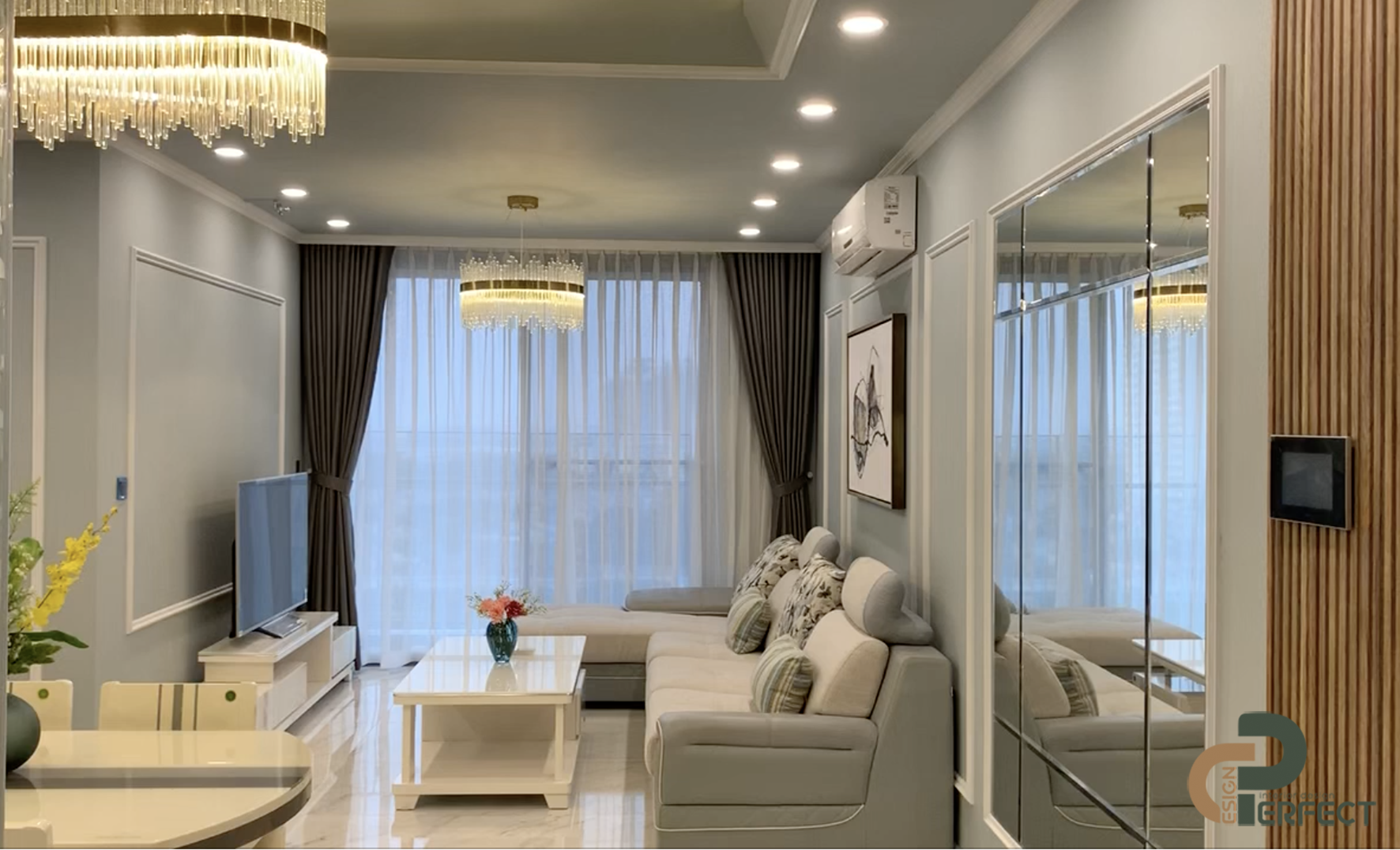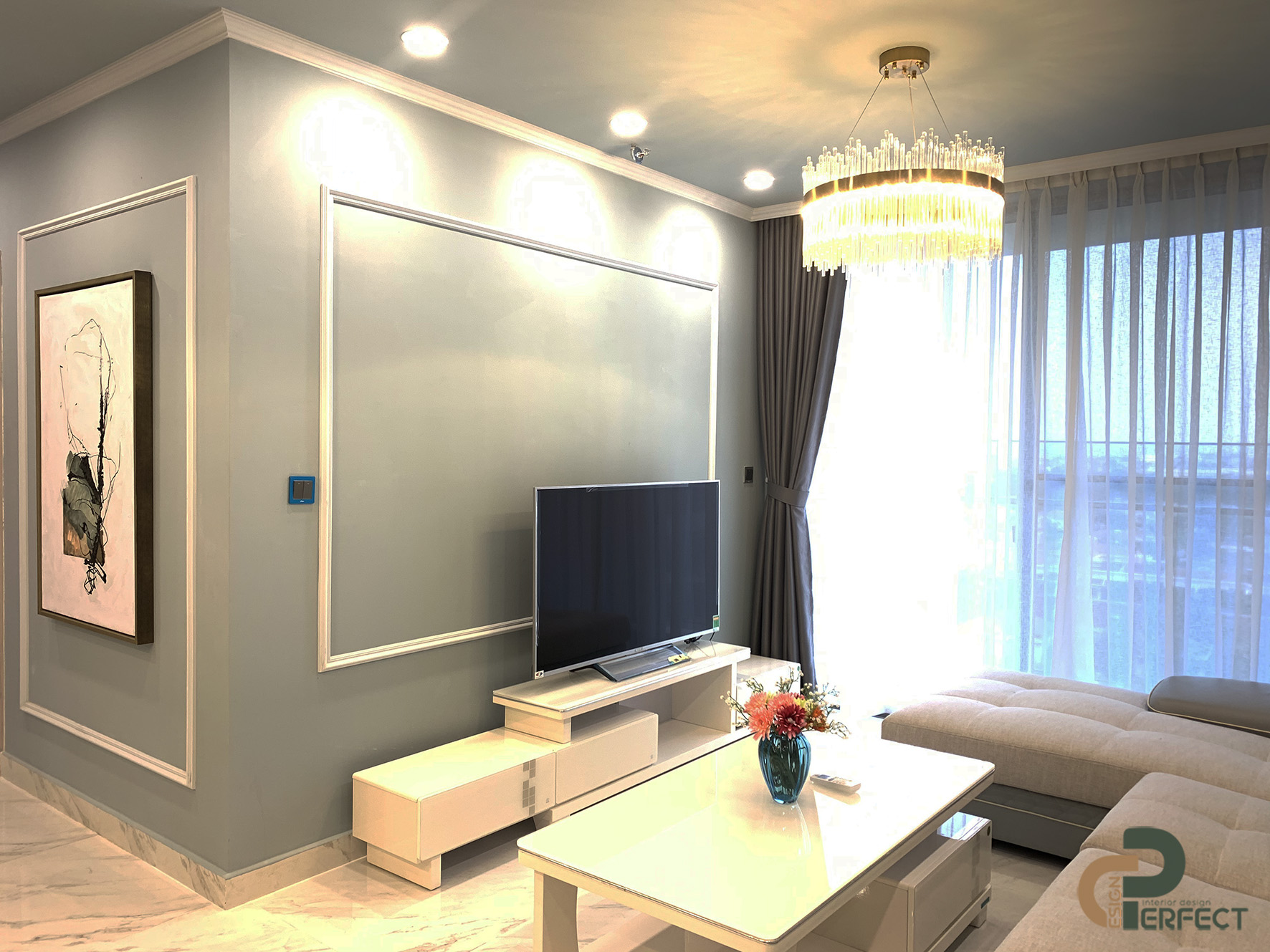 Tường cách điệu với đường chỉ màu trắng không quá nổi bật nhưng đem lại sự hài hòa cho cả căn hộ. Tranh treo tường nghệ thuật được bố trí rải rác, đèn trần trang trí và hệ tủ tivi tạo sự sinh động, đẹp mắt và không quá đơn điệu cho cả không gian dù Perfect Design chỉ sử dụng những tone màu trầm.