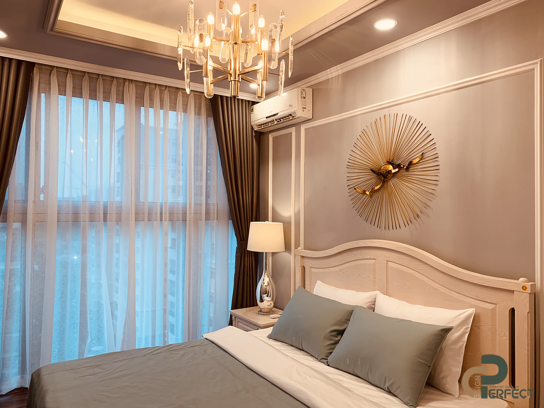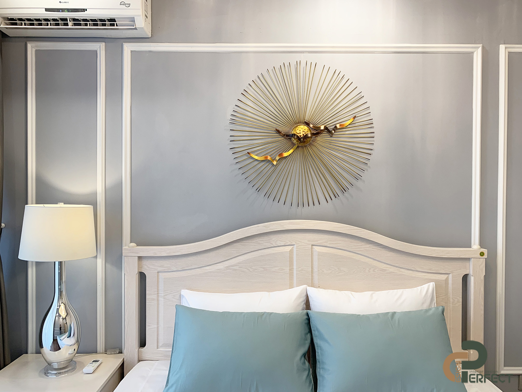 Chưa hết, phòng ngủ phụ vẫn sử dụng lối thiết kế cơ bản của phòng ngủ chính. Tuy nhiên, phòng ngủ chính có đèn ngủ được trang bị cả hai bên tạo nên sự đối xứng đẹp mắt còn phòng phụ chỉ được Perfect Design thiết kế một đèn ngủ một bên vì không gian không quá rộng rãi. Ngoài ra, nhà thiết kế của chúng tôi cũng không sử dụng lại bông hoa để trang trí đầu giường mà thay vào đó là hình mặt trời cách điệu vô cùng đẹp mắt, điều này cũng giúp khách tới thăm nhà phân biệt được 2 loại phòng ngủ này.