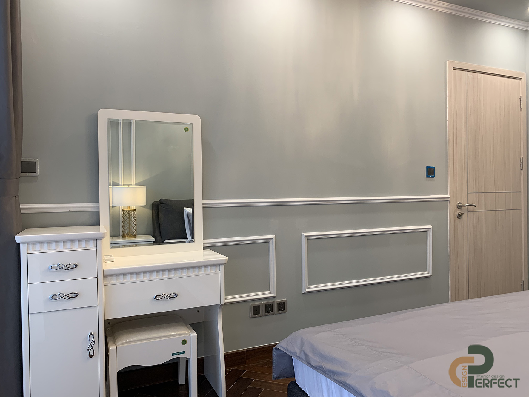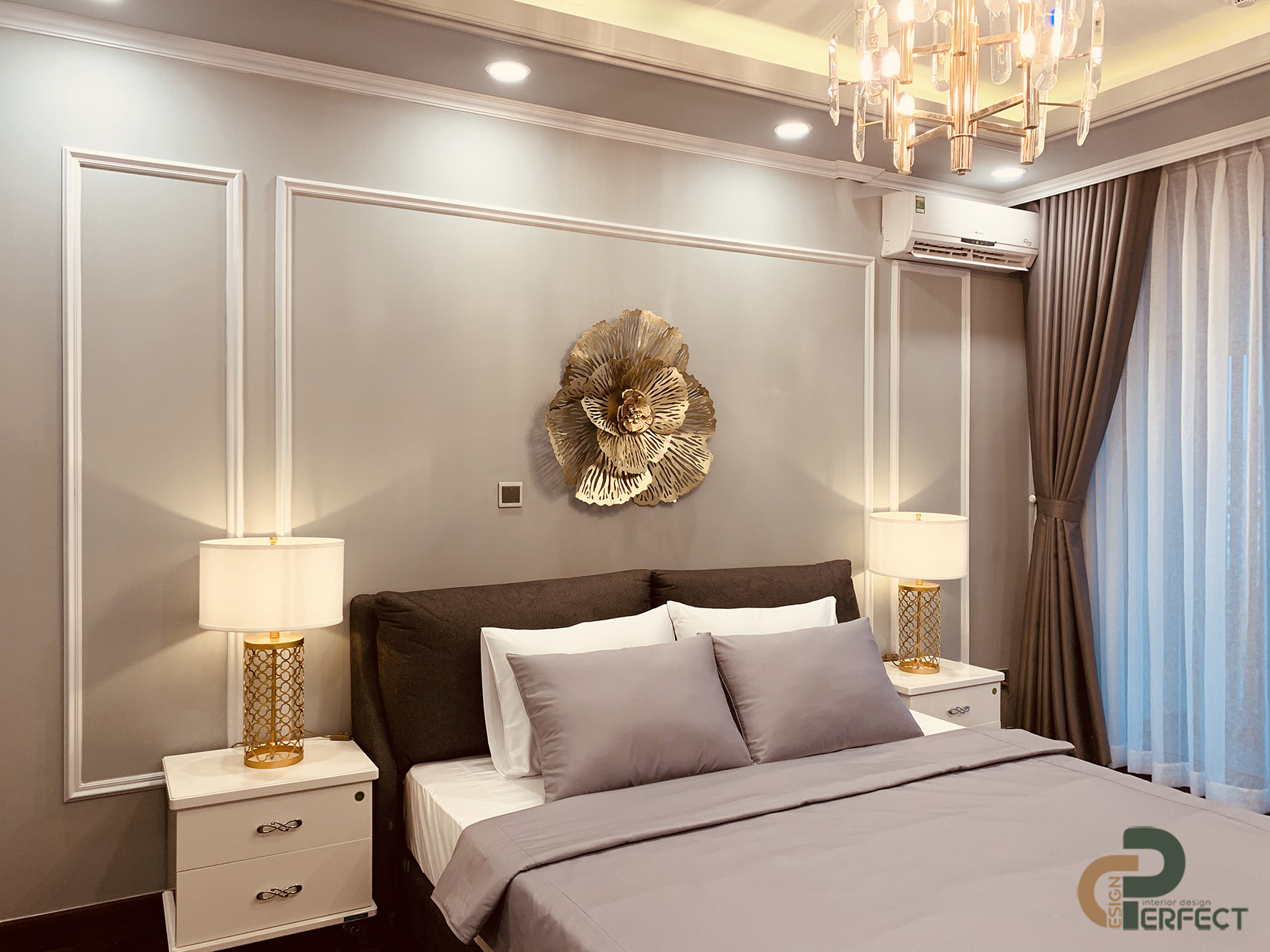 Phòng ngủ được thiết kế rộng rãi với điểm nhấn là bông hoa cách điệu màu vàng vô cùng nổi bật và sang trọng ở đầu giường. Bàn trang điểm nhỏ gọn được thiết kế gần kề với vị trí cửa phòng và ngay cạnh cửa sổ có ánh sáng tự nhiên và rất thoáng mát. Nhờ cách sắp xếp và bố trí nội thất khoa học, Perfect Design đã mang đến không gian nghỉ ngơi tiện nghi và vô cùng thoải mái cho gia chủ.