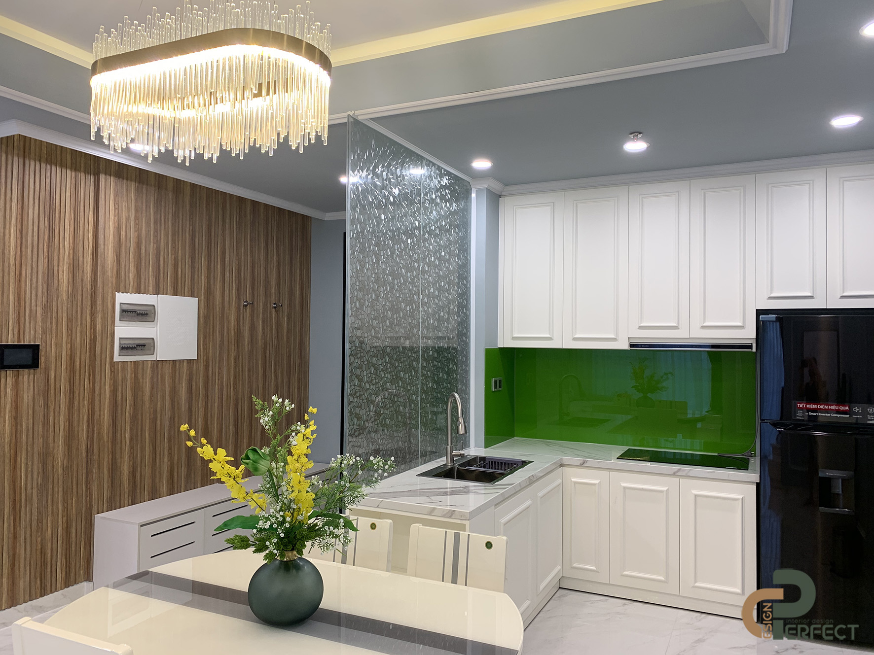 Cạnh phòng khách là không gian nấu nướng của gia chủ, ăn uống hàng ngày của gia đình, tất cả đều được bố trí gần lối ra vào. Vì không gian này có diện tích không quá rộng rãi nên người thiết kế của Perfect Design đã sử dụng tủ bếp chữ L sử dụng gỗ MDF làm vật liệu chính, thiết kế cả hai hệ tủ trên và dưới đã tạo ra nhiều không gian lưu trữ hơn cho gia chủ. Vì thế nên gian bếp của gia đình sẽ luôn trong tình trạng gọn gàng, ngăn nắp. Kính ốp tường màu xanh lá vô cùng nổi bật chính là điểm nhấn cho không gian này, cùng với đó cũng tạo nên sự mát mẻ, tươi mới hơn cho không gian này. Cả lối ra vào và vị trí gần phòng bếp đều được chúng tôi trang bị thêm những hộc tủ đa năng, tiện dụng có thể dùng để đựng bất kỳ thứ gì.