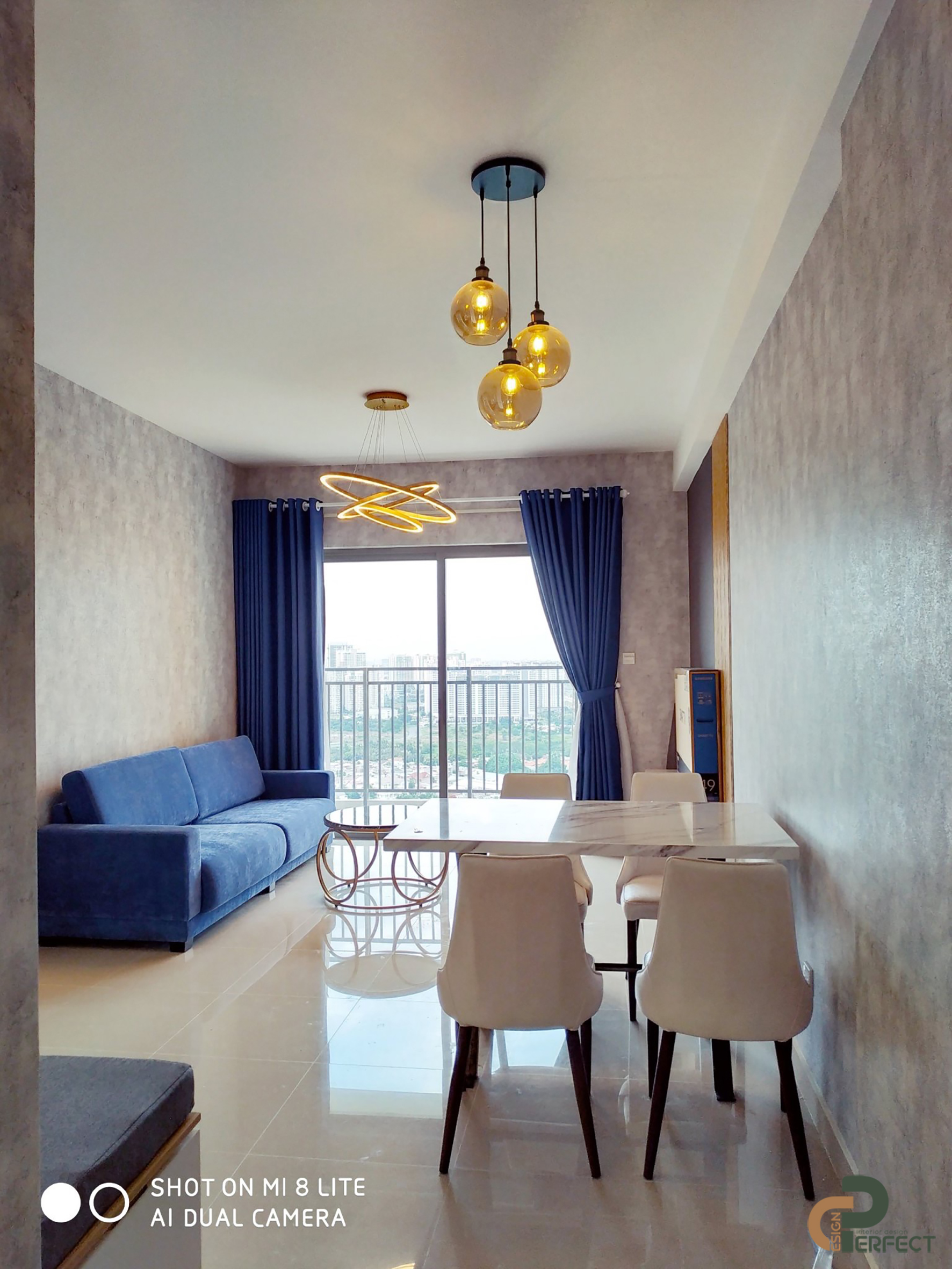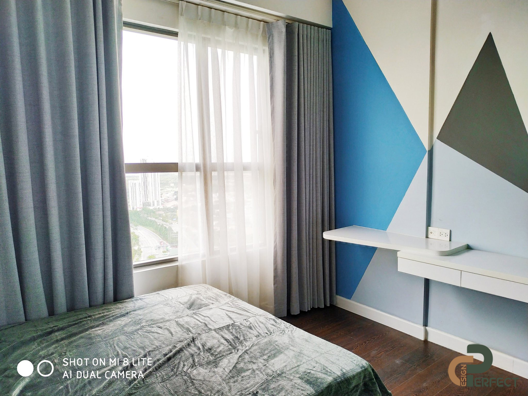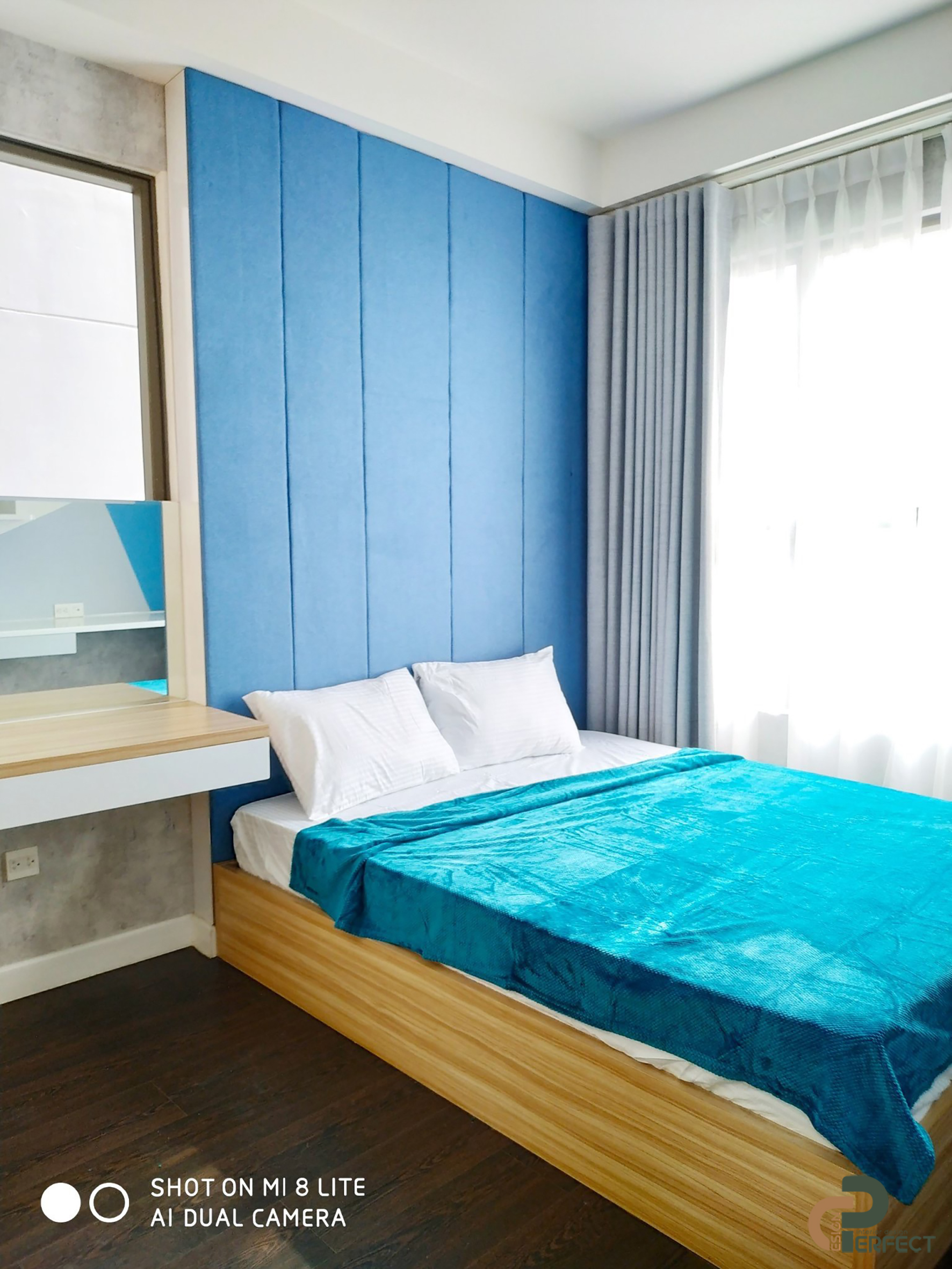 Vẫn sử dụng màu xanh navy và các gam màu trung tính để đồng bộ hơn cho tổng thể căn hộ. Chưa hết, chúng tôi đã sử dụng bộ rèm màn hai lớp để gia chủ có thể hưởng trọn được nguồn ánh sáng tự nhiên và dễ dàng hơn trong việc điều khiển độ sáng tối cho căn phòng.