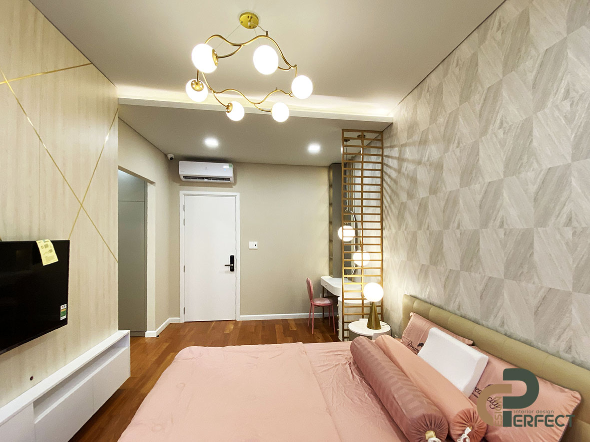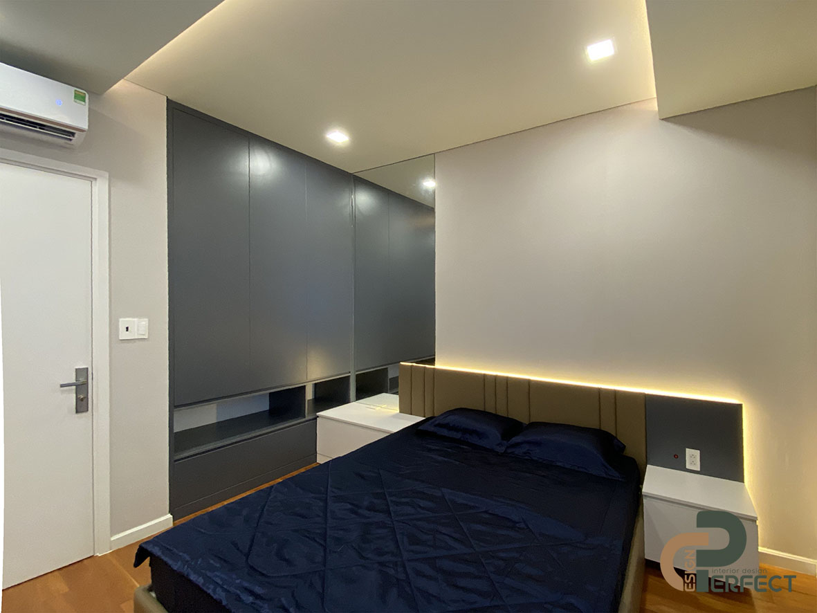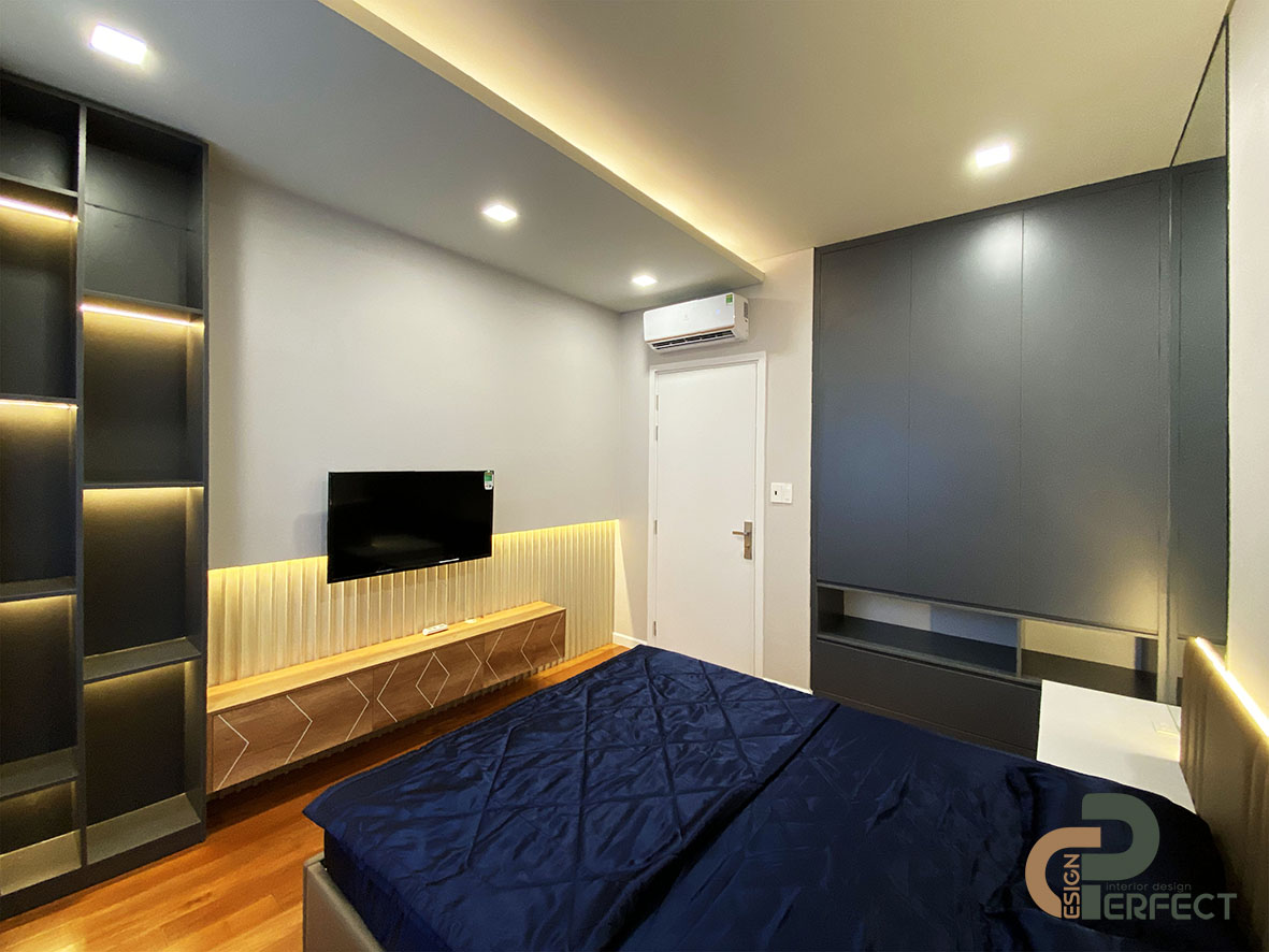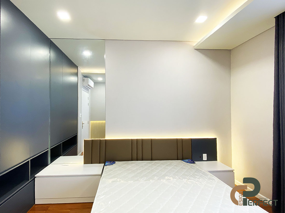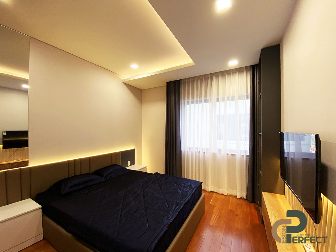 Để tạo được không ấm cúng và thoải mái cho nội thất phòng ngủ master, đòi hỏi người thiết kế của chúng tôi phải dày dặn kinh nghiệm để mang lại sự hài hòa cho mọi vật dụng nội thất. Không chỉ có một số nội thất cơ bản như: giường, tivi, bàn trang điểm… mà khu vực này còn được trang bị rất nhiều những vật dụng khác để không gian này được tối ưu hơn. Giường ngủ vô cùng sang trọng và tinh xảo với thiết kế nệm bọc đầu giường. Kệ tivi cũng được tích hợp thành tủ đựng đồ cá nhân như túi xách hay các đồ trang trí nho nhỏ.