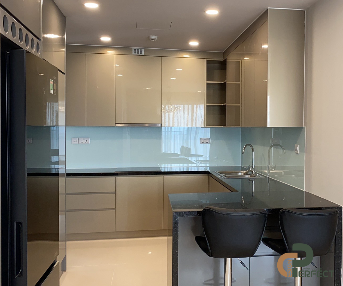 Hệ thống tủ bếp có thể chống ẩm và dễ dàng bị sinh bởi được làm từ MDF. Vì sở hữu nhiều ngăn đựng nên người dùng có thể lưu trữ nhiều đồ dùng, từ đó giúp căn bếp trở nên gọn gàng hơn.