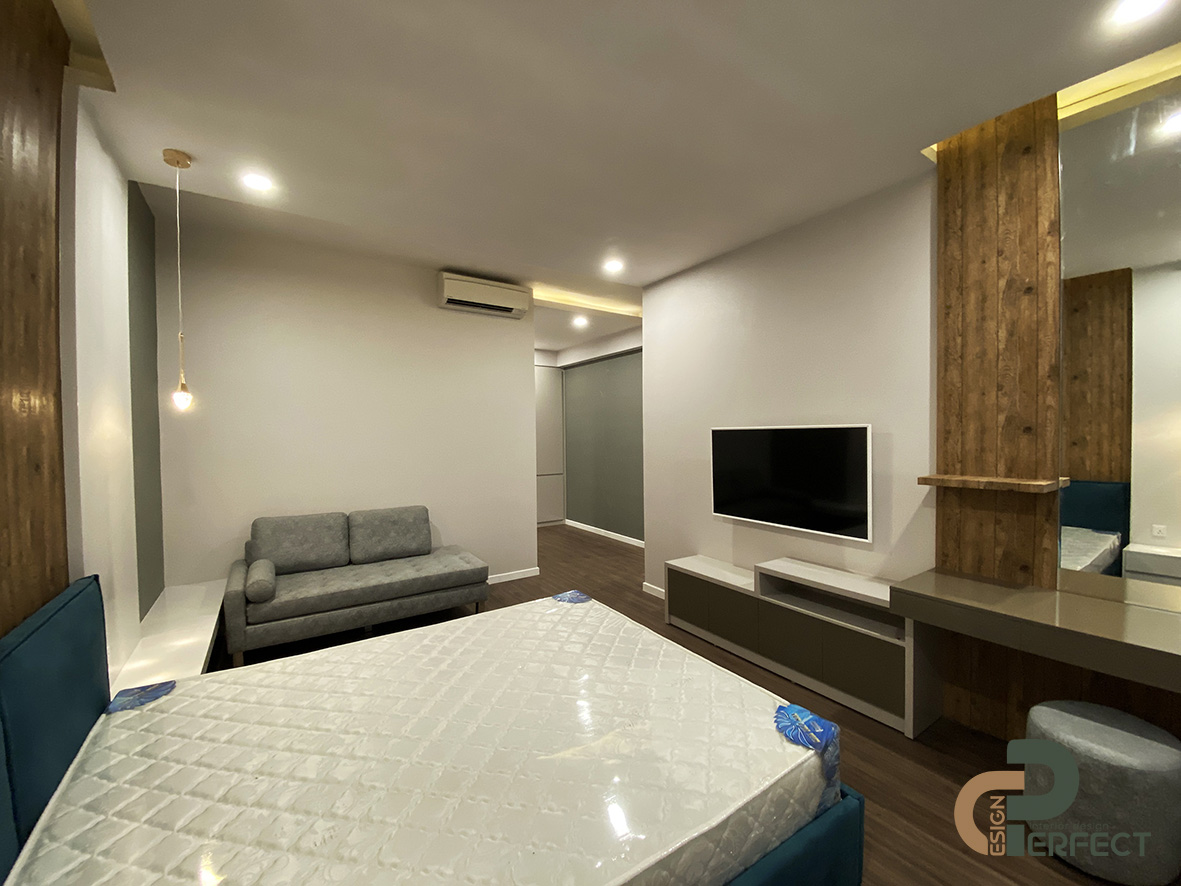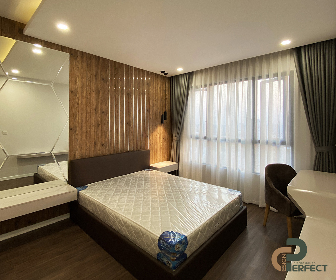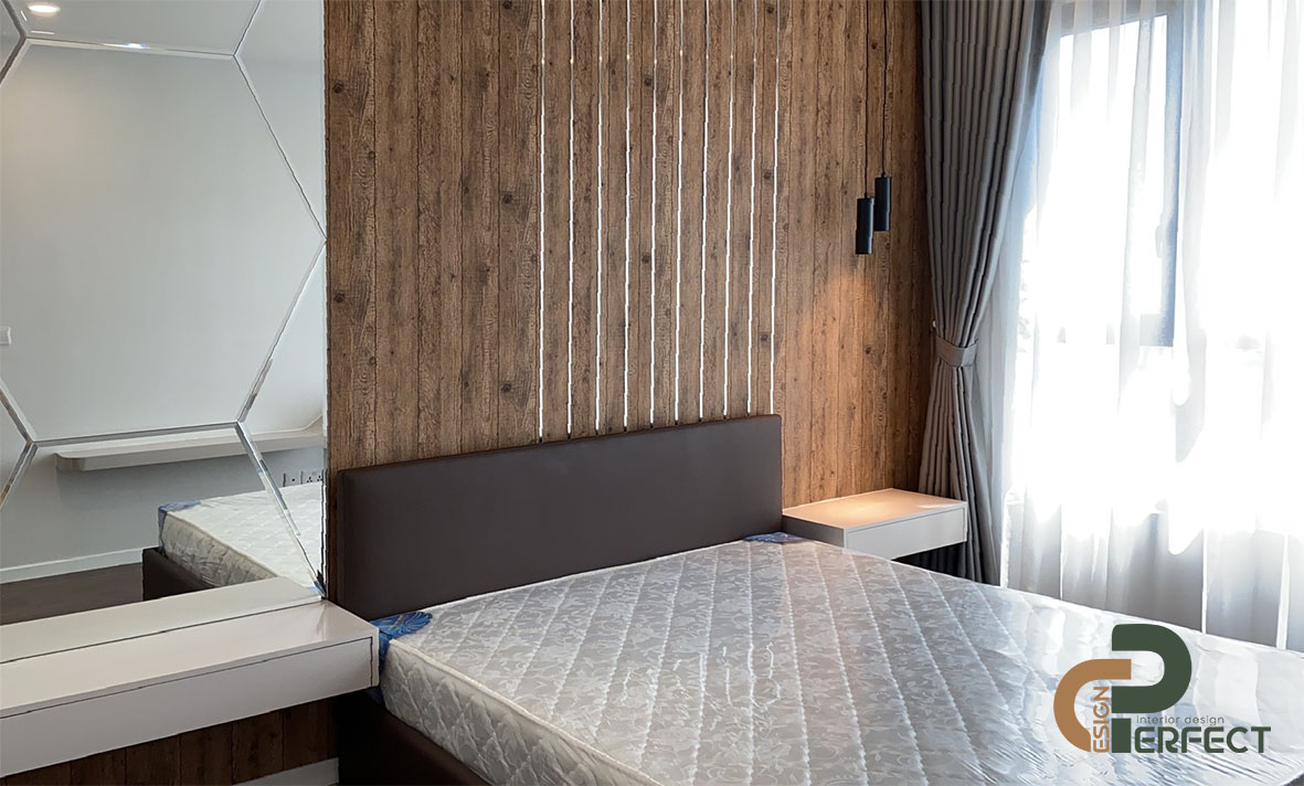 Vẫn sử dụng những gam màu trung tính để đồng bộ cho toàn căn hộ, nhưng phòng ngủ master lại có những điểm nhấn ấn tượng hơn là các mảng tường được ốp gỗ sang trọng. Để giúp cho gia chủ có những ngủ ngon sau một ngày dài mệt mỏi, chúng tôi đã sử dụng đèn có ánh vàng để mang lại sự thư giãn và ấm cúng hơn cho căn phòng.