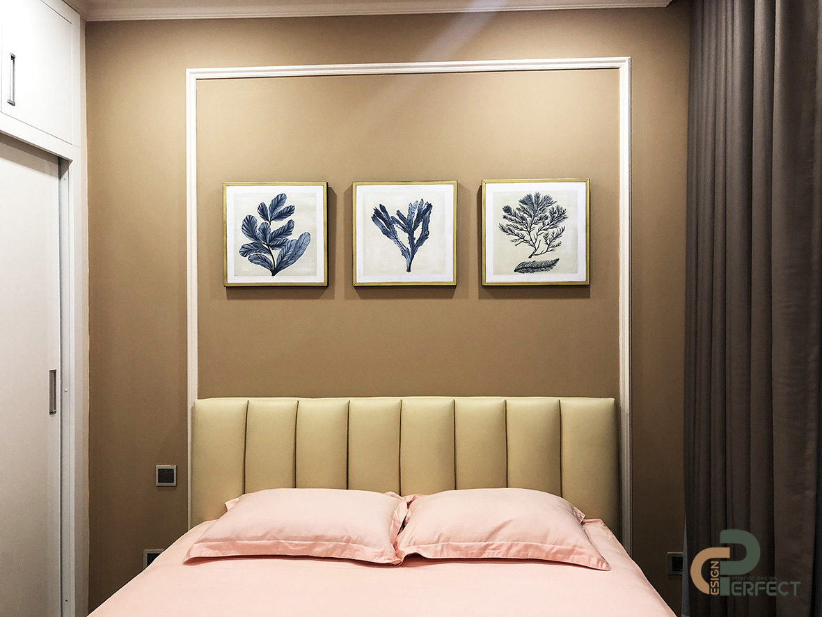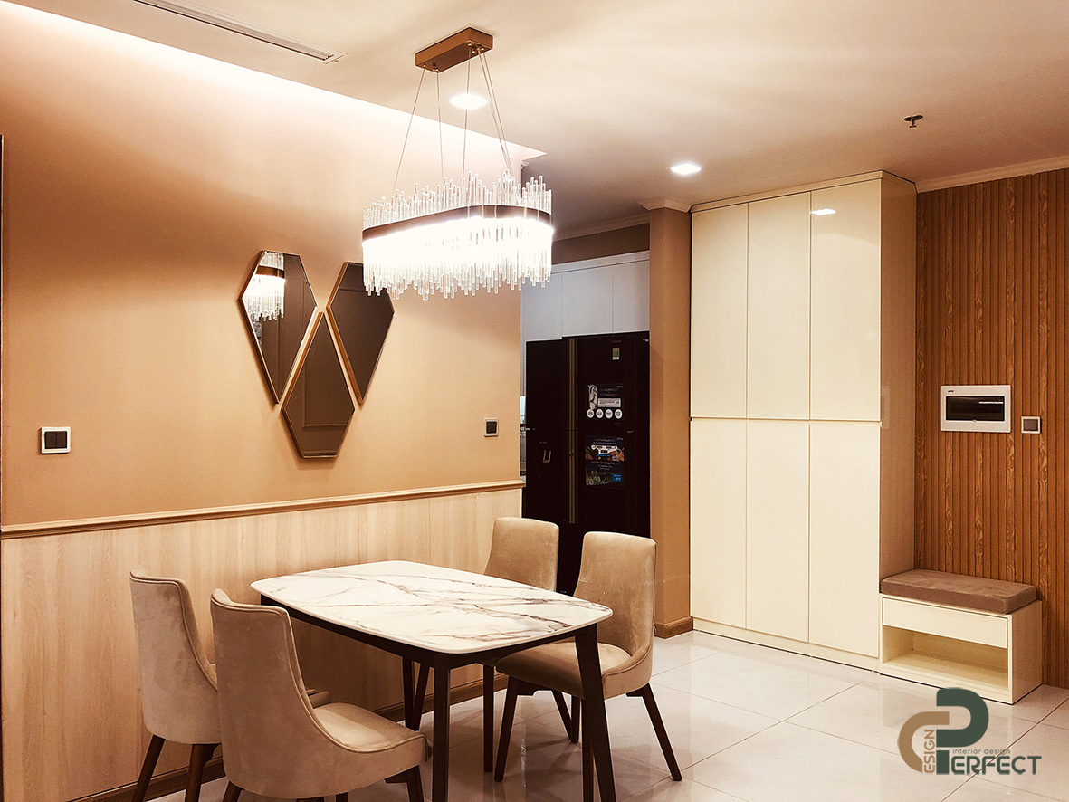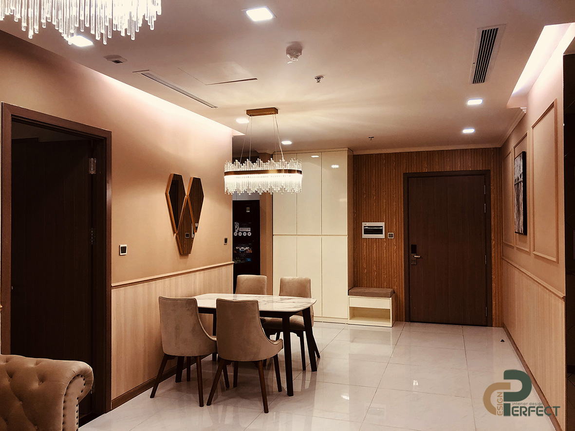 Việc sử dụng hoàn toàn gam màu vàng gold đã giúp căn hộ trở nên cao cấp hơn bao giờ hết. Để thêm phần sang trọng, Perfect Design đã lựa chọn đèn trần được làm bằng pha lê đẹp mắt. Bộ bàn ghế đặt tại phòng khách với phong cách đương đại cũng là điểm nhấn nổi bật cho không gian này.