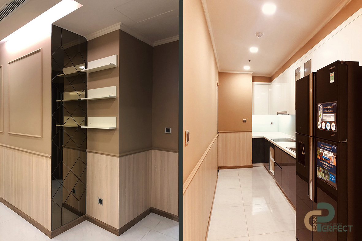 Vì diện tích khá nhỏ, Perfect Design đã lựa chọn giải pháp là bố trí bếp sát tường và lắp kệ lưu trữ chữ L được đo ni đóng giày theo diện tích căn hộ. Giúp không gian gọn gàng, gia chủ dễ dàng hơn trong việc nấu nướng và còn rất thẩm mỹ.