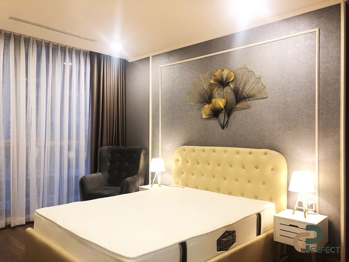 Phòng ngủ Master cũng sử dụng gam màu xám trung tính để tạo cảm giác dễ chịu và thoải mái cho gia chủ sau một ngày làm việc vất vả. Và tất nhiên, không thể thiếu những vật dụng nội thất nhỏ nhắn mà gia chủ yêu thích cho không gian này. Đèn ngủ và tủ đầu giường được đặt 2 bên tạo vẻ đẹp đối xứng. Ngoài ra, chúng tôi còn sử dụng một chiếc ghế sô pha để gia chủ chủ có thể đọc sách thư giãn trước khi ngủ. Tất cả vật dụng được Perfect Design bài trí một cách logic và đẹp mắt cho không gian.