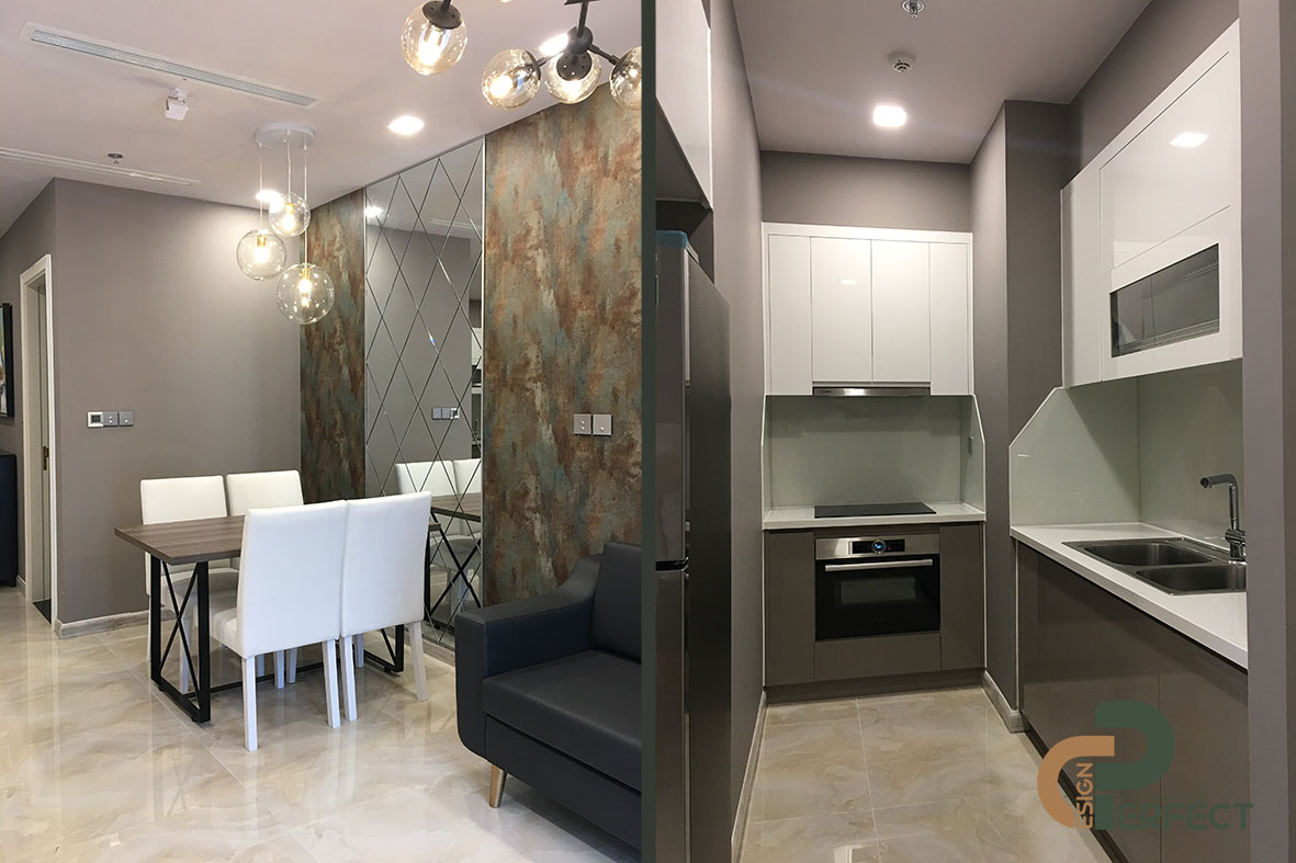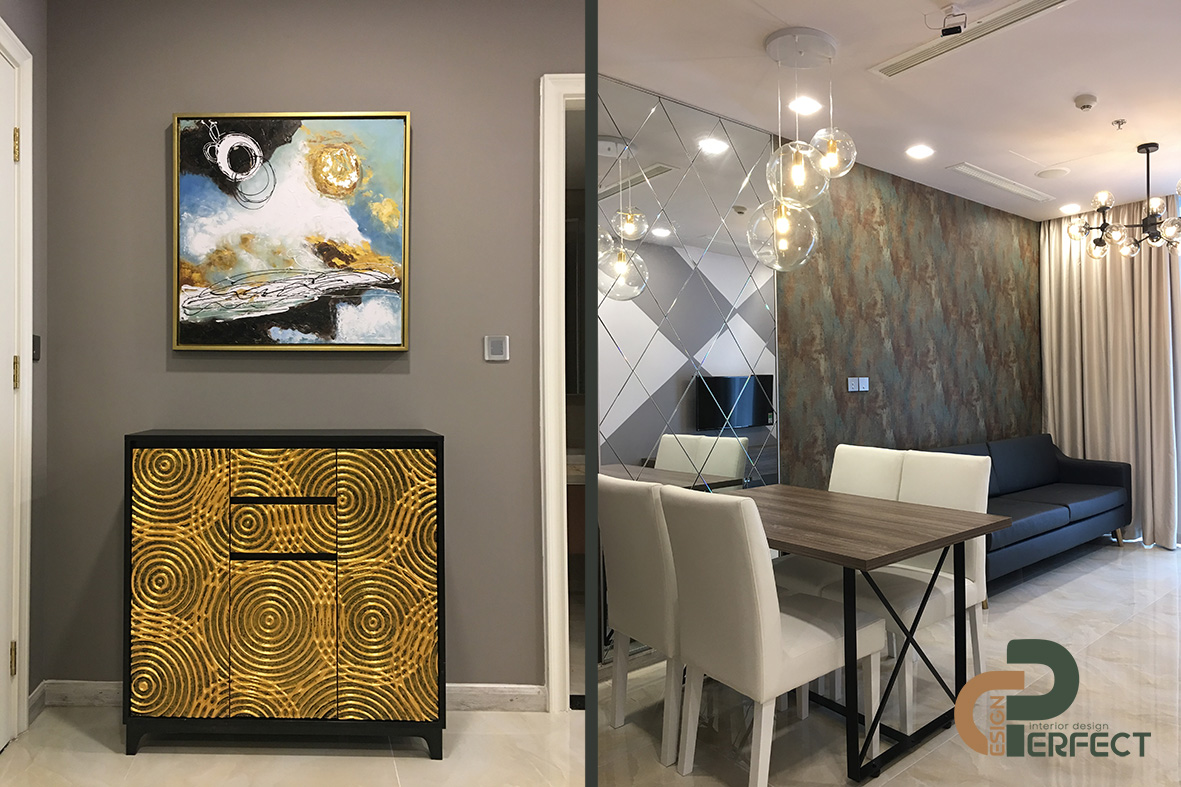 Bàn ăn và phòng bếp được tách rời thành hai khu vực. Bàn ăn được đặt sát tường để tiết kiệm diện tích cho căn hộ. Perfect Design đã sử dụng những tấm gương nhỏ hình thoi để tạo thành một tấm gương lớn tại khu vực bàn ăn. Cách làm này sẽ giúp căn hộ “ăn gian” được diện tích, tạo nên cảm giác rộng rãi hơn và cũng giúp phòng khách bếp hiện lên độc đáo và sang trọng hơn nhờ điểm nhấn này.