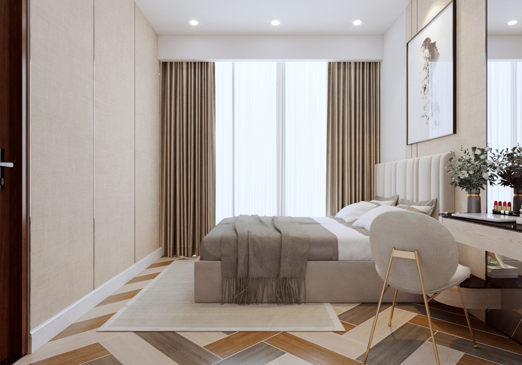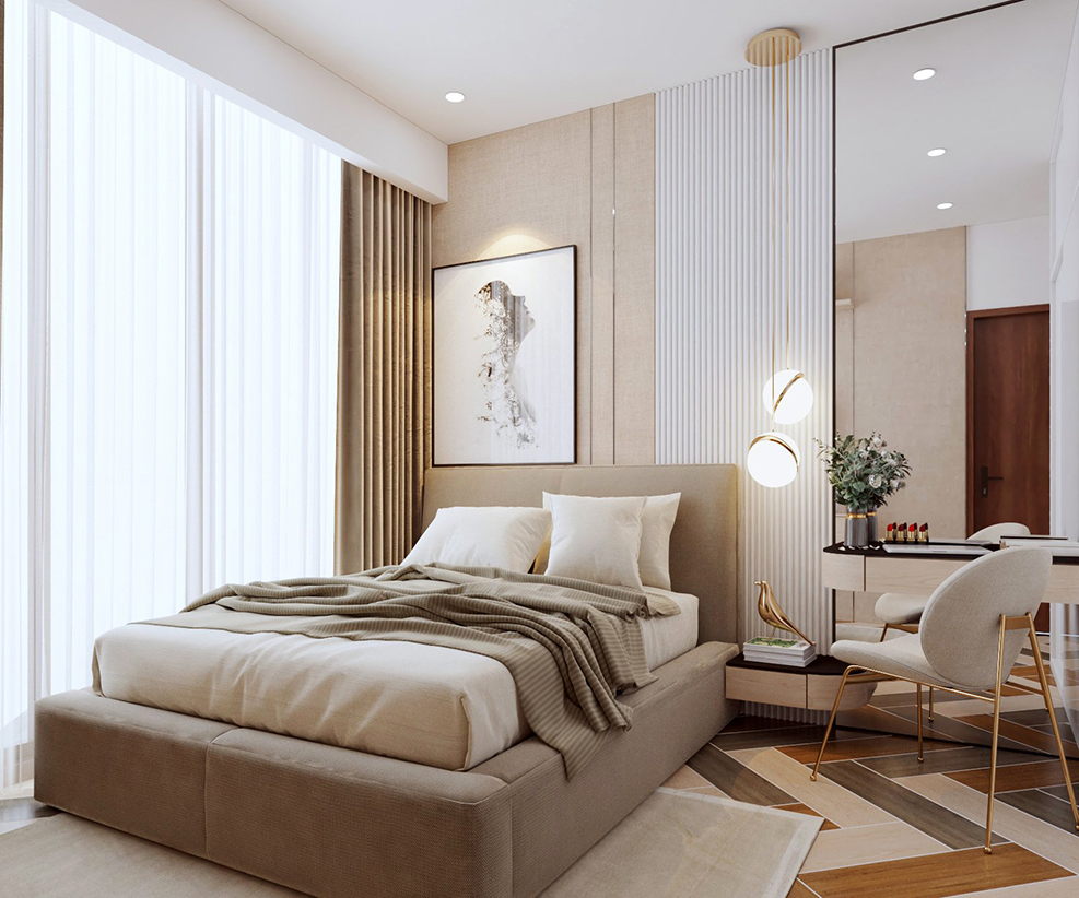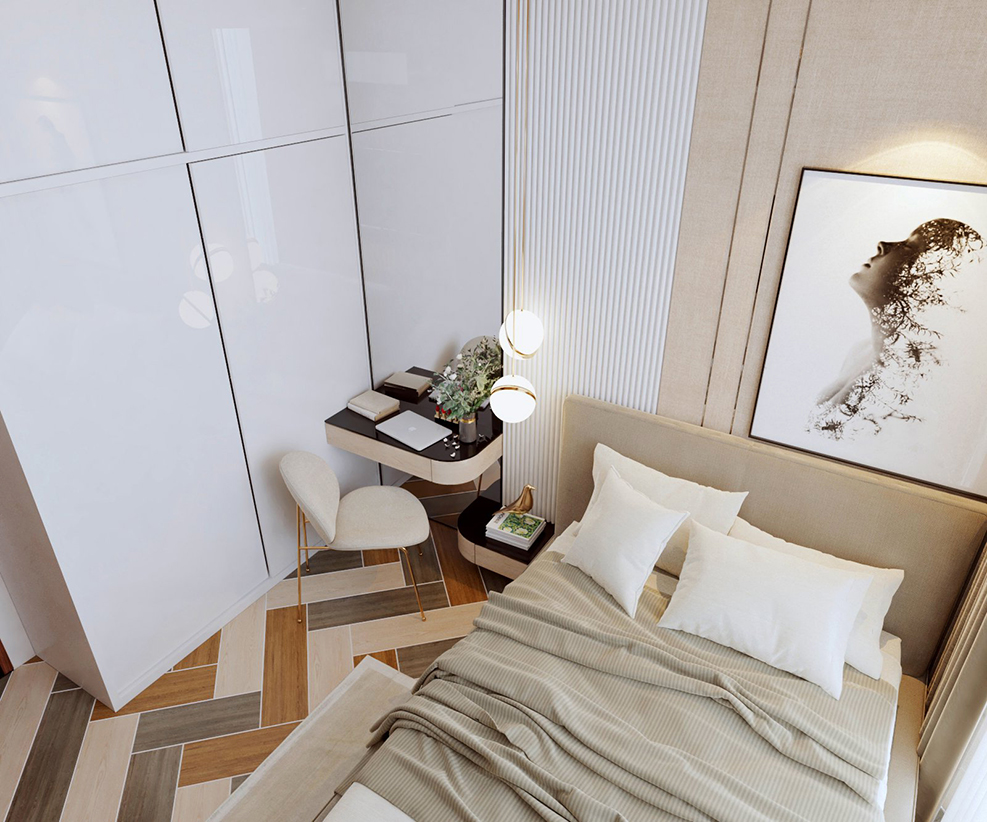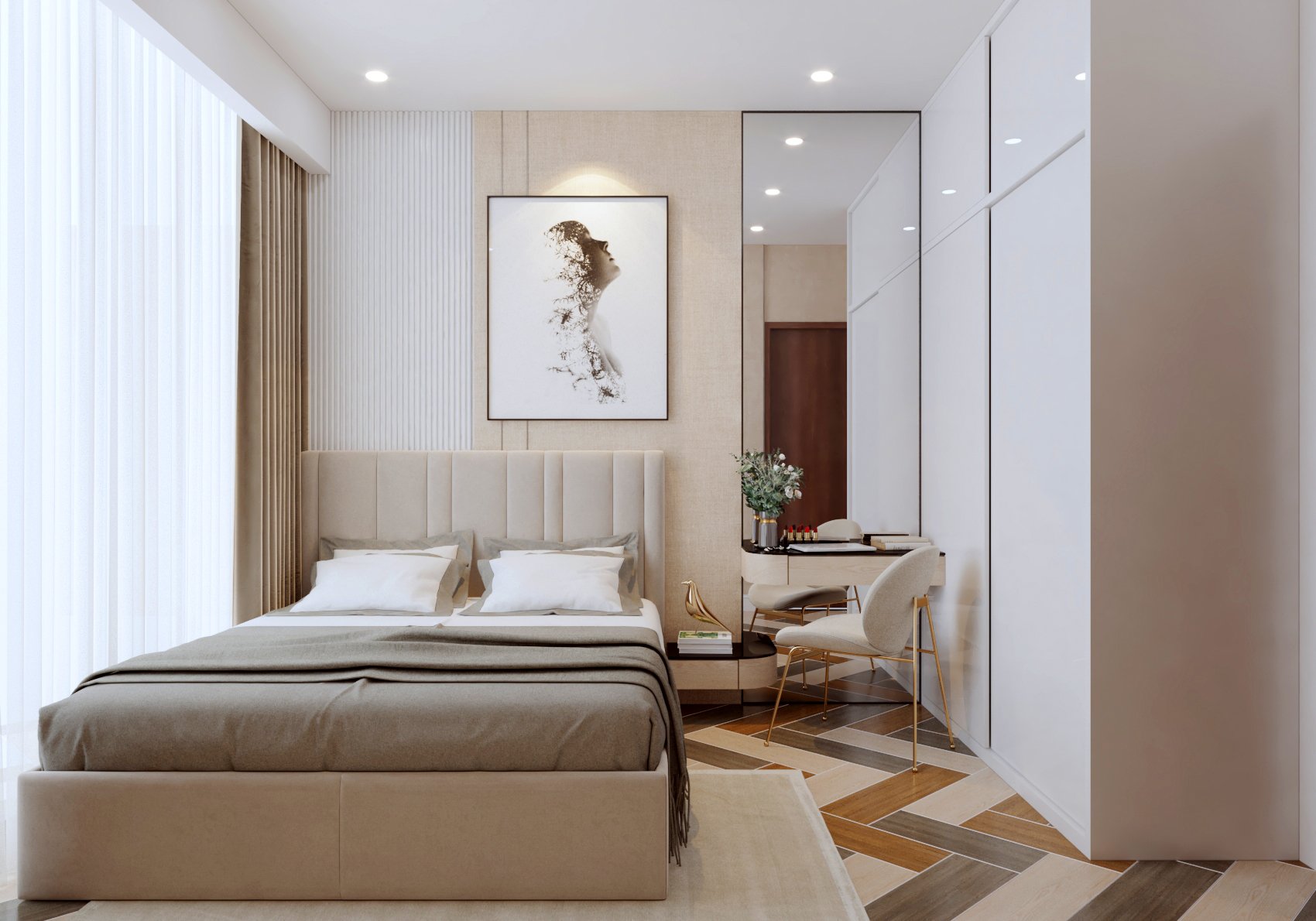 Phòng ngủ được thiết kế nhẹ nhàng, tinh khôi kết hợp với sàn gỗ, thảm nâu mang đến sự khác biệt và ấn tượng. Căn phòng ngủ chỉ sử dụng và bày trí những món đồ nội thất cần thiết nhằm tạo sự thông thoáng, rộng rãi cho không gian nghỉ ngơi như: bàn được bố trí thêm gương cao lên đến sát trần tăng thêm phần tiện nghi cho phòng, ngay cạnh đầu giường với đèn ngủ được thiết kế vô cùng lạ mắt mà nhà thiết muốn đem đến cho người dùng, cùng với đó là bức tranh tường màu trắng cùng tone màu gối làm cho căn phòng trở nên đơn giản nhưng lại vô cùng sang trọng.