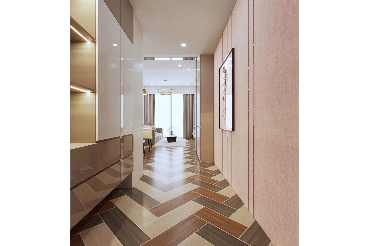 Với không gian rộng thoáng mát qua lại với các phòng, căn hộ còn còn bố trí thêm những bức tranh sang trọng giữa không gian đường đi, đối diện là khung cửa kính với hai lớp rèm cửa lọt vào những ánh sáng tự nhiên, làm không gian trở nên sáng giữa các lối đi, tăng thêm phần sang trọng tinh tế của căn hộ mà nhà thiết kế Perfect design muốn mang lại.