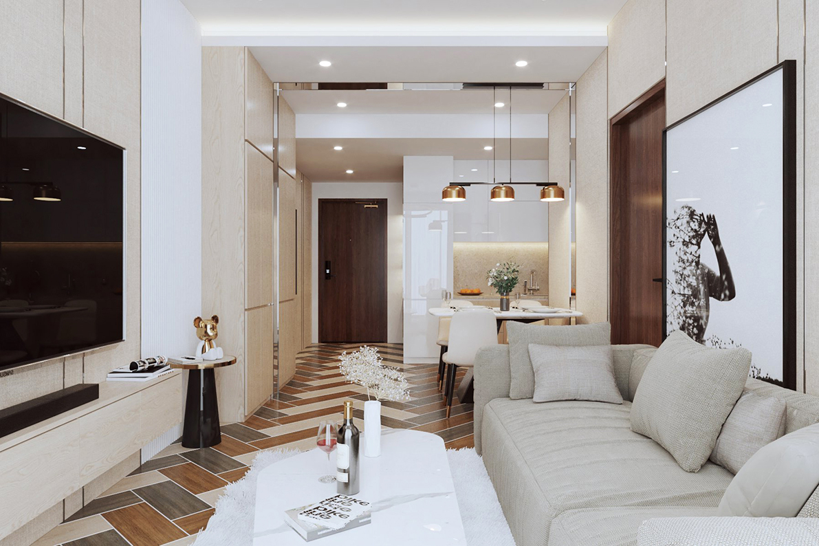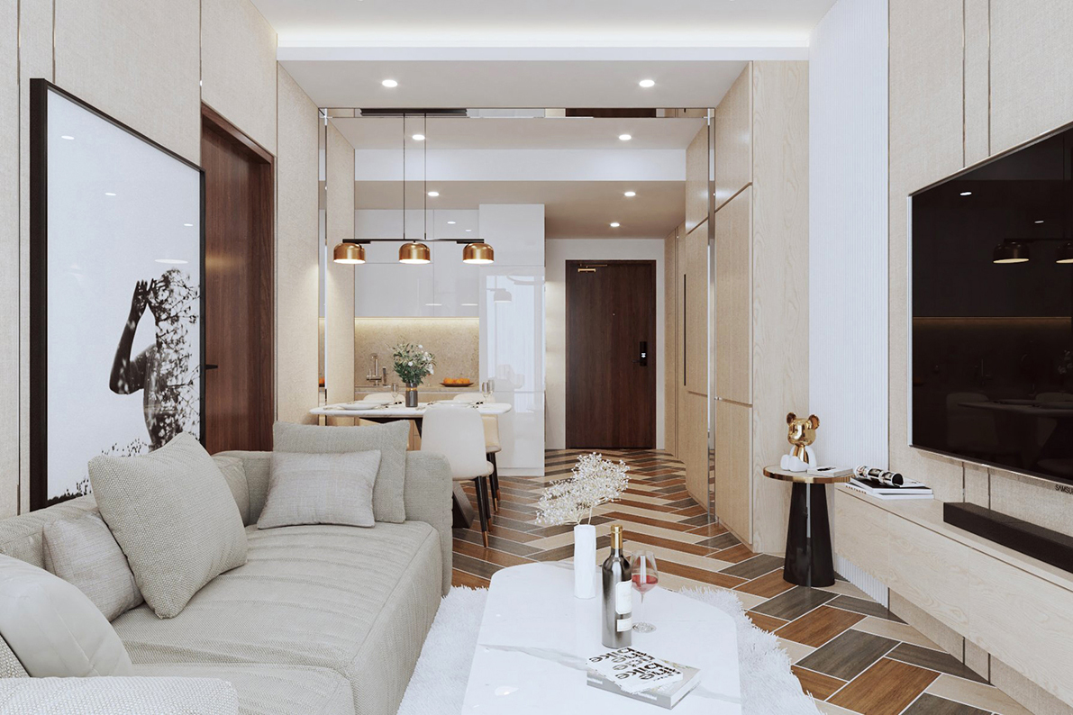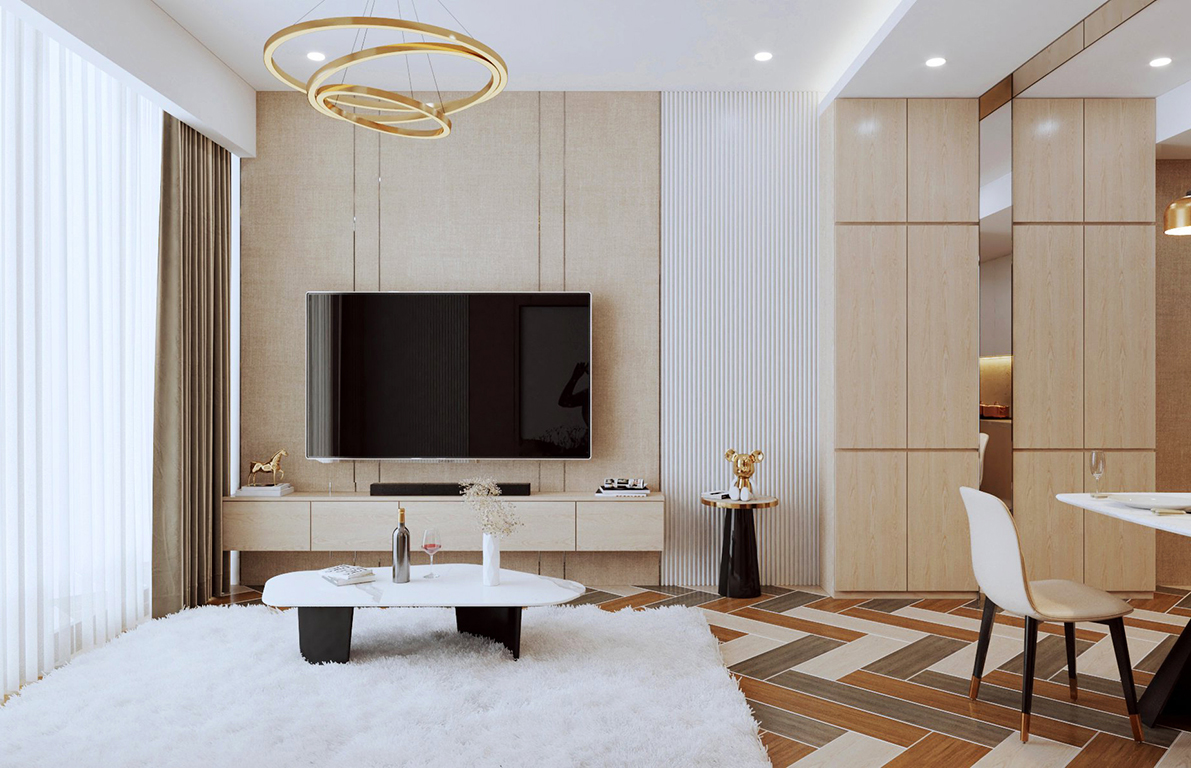 Khu vực sinh hoạt chung hiện đại, sáng thoáng có đầy đủ nội thất bàn ghế sofa, tivi để giải trí, thư giãn. Phòng sinh hoạt chung thiết kế theo phong cách hiện đại chú trọng tới cả công năng và thẩm mỹ, nội thất hướng tới sự đơn giản, nhẹ nhàng.