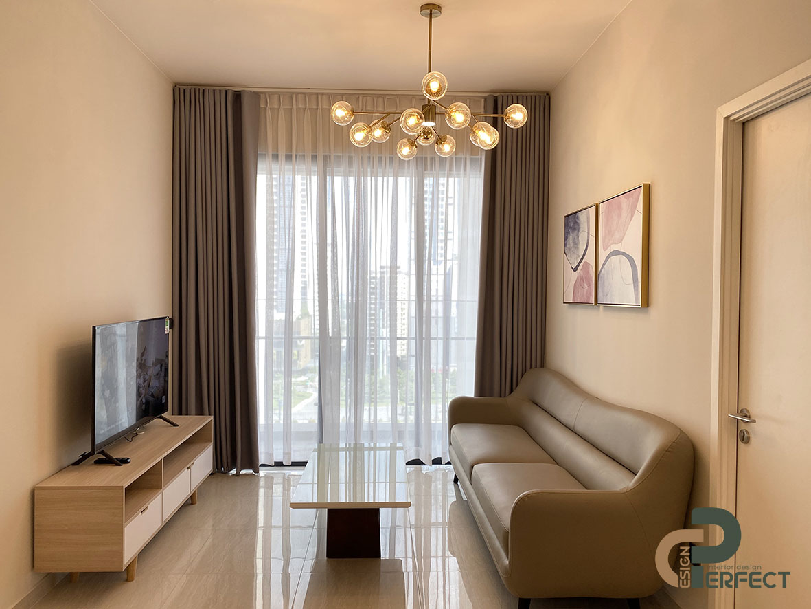 Căn hộ có tone màu trung tính là chủ đạo, được điểm xuyết thêm bằng bức tranh vô cùng nghệ thuật và đèn trần đẹp mắt. Việc sử dụng nội thất gỗ cho kệ tivi cũng mang lại vẻ đẹp mộc mạc – ấm áp – thông thoáng cho không gian sống. Vậy nên thiết kế phòng khách đã trở nên đơn giản và tinh tế hơn bao giờ hết.