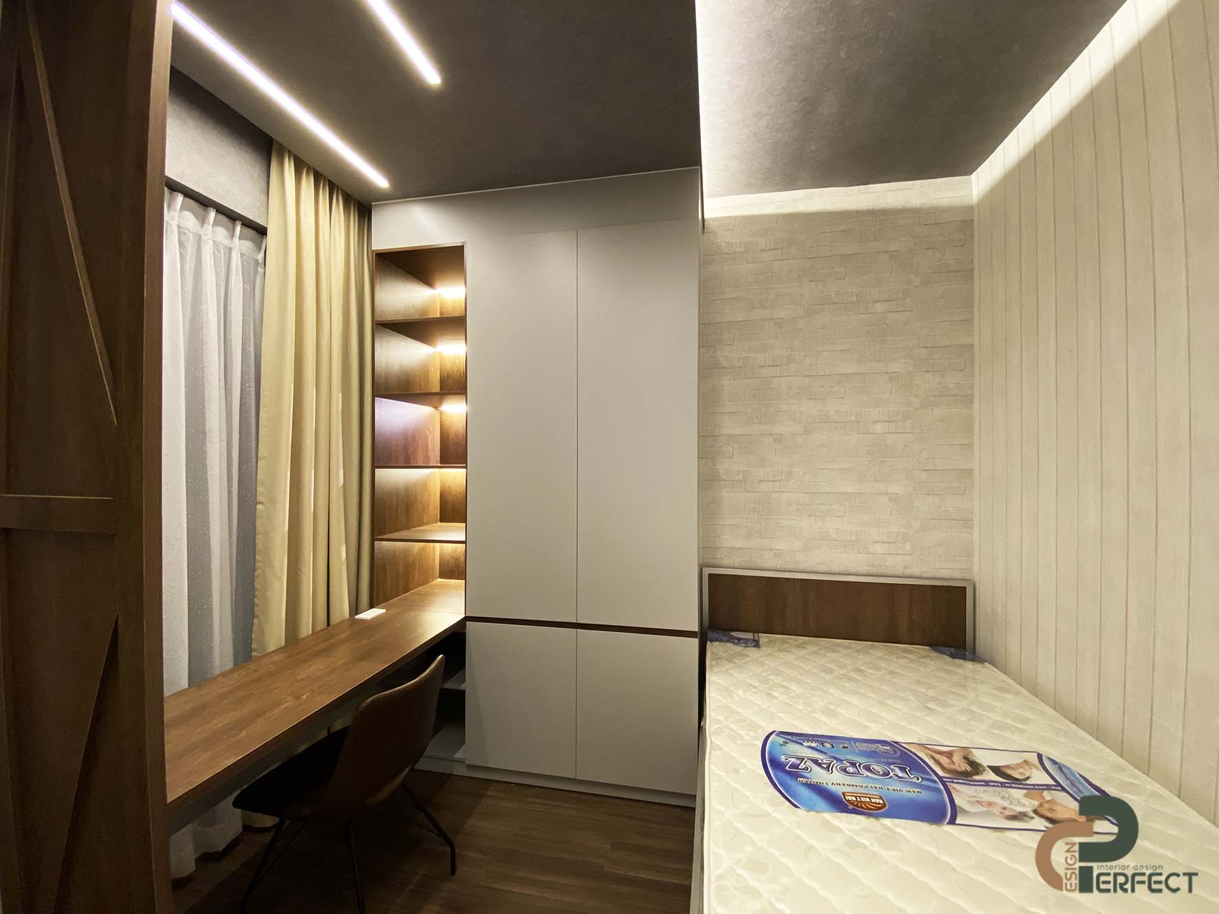 不要像主卧室那样使用深色调,但次卧室有更明亮的颜色。 Perfect Design 以实用性为标准进行设计,将房间的整个内部选择为可以结合多种功能的物品,例如:学习桌,可以扩展为橱柜的工作台,衣服或还可以用作存放个人物品的地方。