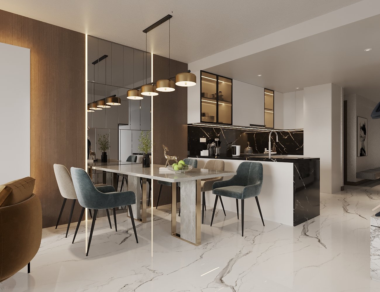 Perfect Design在公寓内布置了很多吸顶灯系统,结合吸顶灯设计精美纤薄,让客厅充满光线。软垫沙发将为居住者营造柔软舒适的感觉,灰色和棕色两种主色调使空间更加奢华和精致。黑色的木制茶几为这个区域的优雅和魅力做出了贡献。